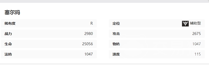 在物防和法防方面,塞尔玛同样表现出色,她的物防和法防均达到了1047,这使得她能够抵御来自物理和魔法的双重攻击,无论是近战还是远程,她都能对付,也是一个不错的辅助了,速度方面,塞尔玛的速度值为115。虽然这个数值并不算顶尖,但足以让她及时支援需要帮助的队友,她的攻击、生命还是比较均衡的,至少在R级里面不算拉,但是后期强度上面就必须要培养,不培养的话,后期很多的战斗是不适合上场的。