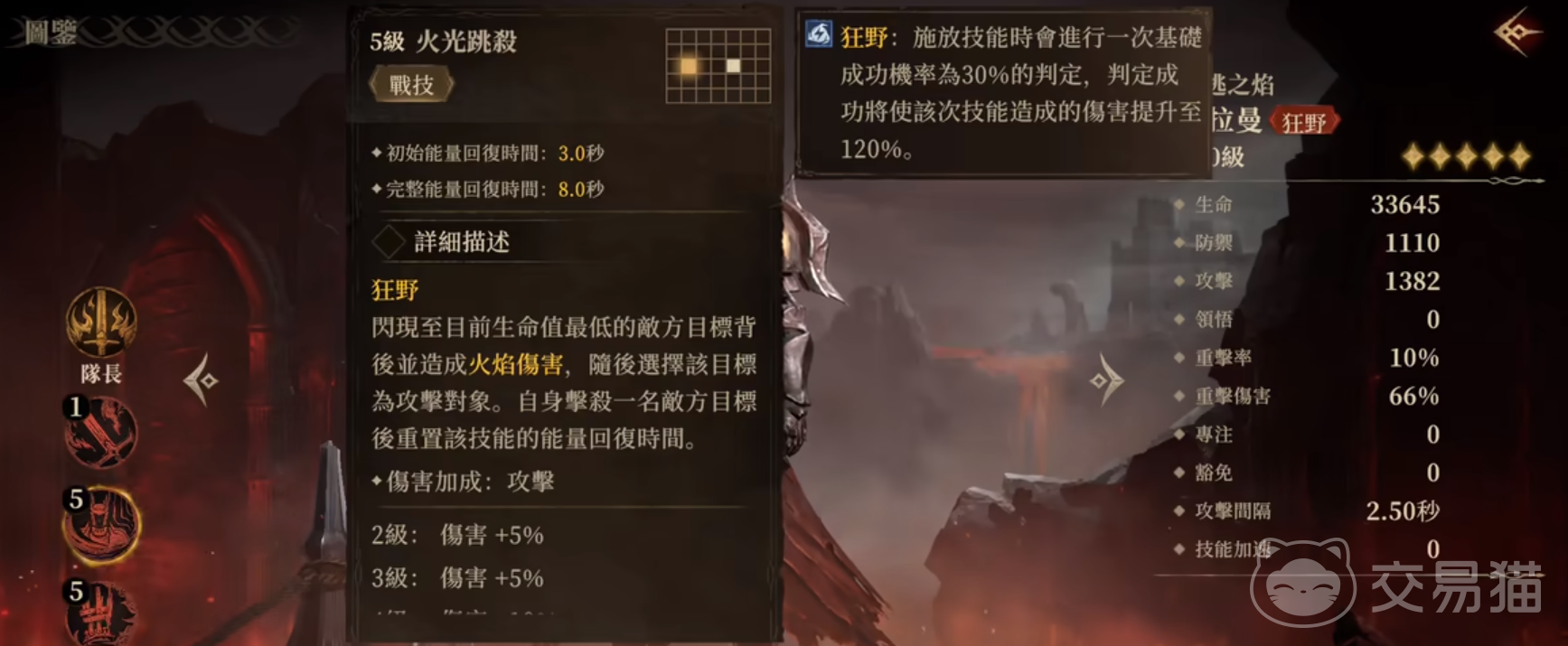 前排放卡拉曼,这是火属性狂野系打高伤的核心英雄,他的主动技能可以闪现到生命值最低的敌方目标背后,进行火焰属性伤害背刺,如果技能一次击杀,就会重置能量恢复的时间,针对单体血量较少的脆皮阵容刷技能非常快。