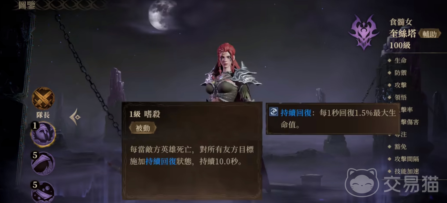 奎丝塔有很强的自保能力,建议放在后排,可以在战斗中跳上敌方的,目标对其造成高额的暗属性伤害,并且偷取30%威能,攻击结束还能获取基于攻击力的治疗量。