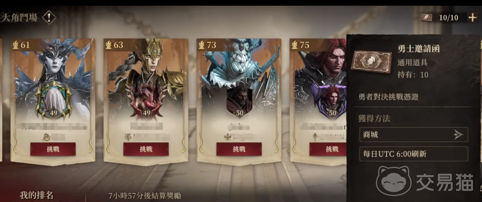 玩家使用商城里面购买到的勇士邀请函进入大角斗场,可以在自己的排行以下随机快速挑战,获胜则提升自己的排名。如果想要更快拿到高排名,就要跟跨排名的对手挑战。
