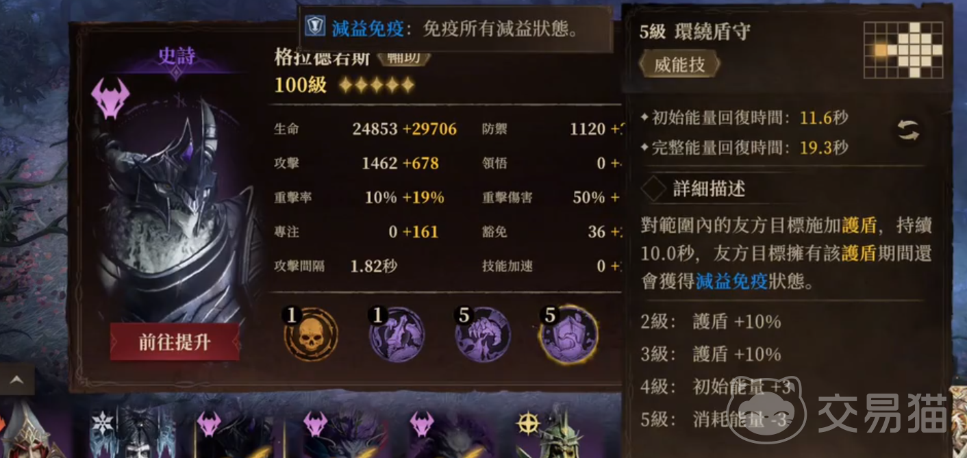 格拉德若斯是史诗辅助,可以给全队加10秒钟的护盾,有护盾的期间还能够获得减益免疫的buff。