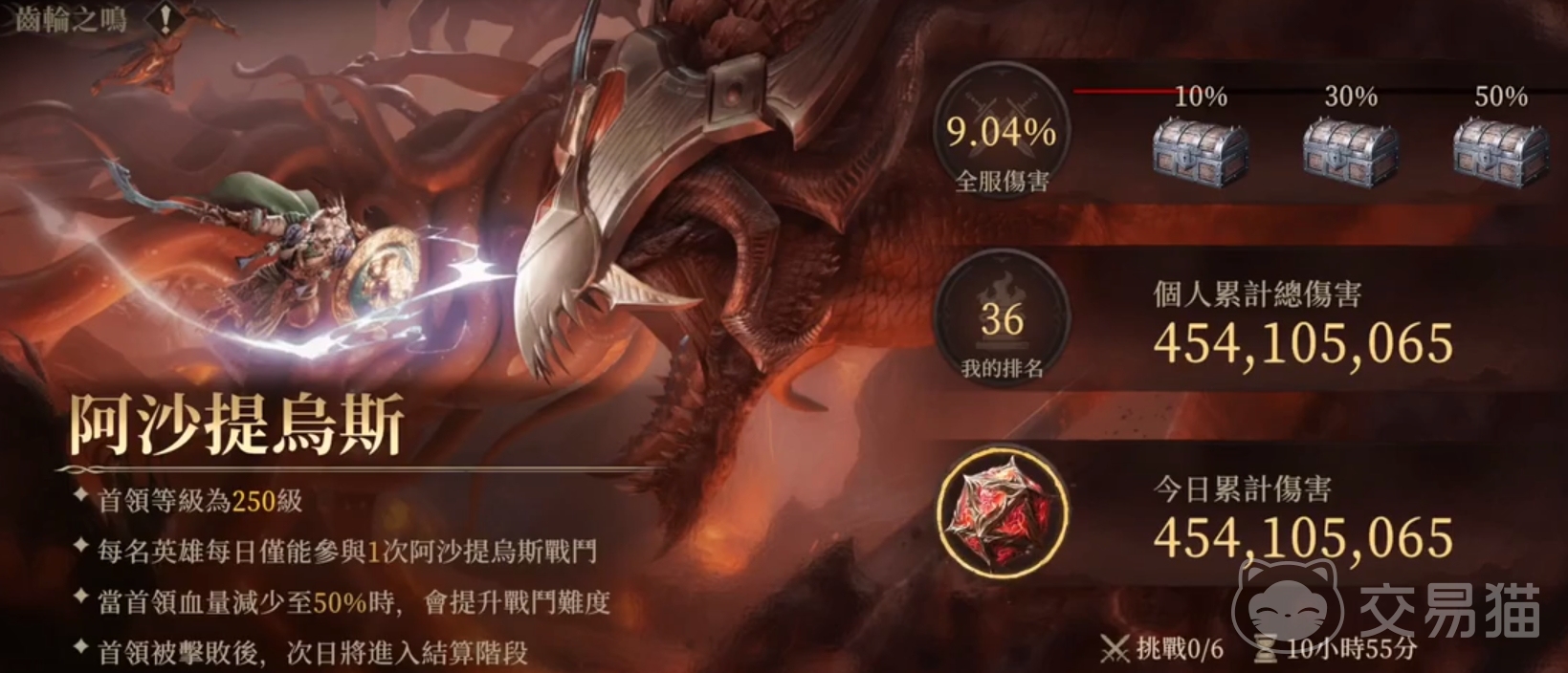 齿轮之鸣中的挑战boss阿沙提乌斯,首领等级为250级,玩家每天可以组建阵容进行挑战,每日积累积的伤害数会登录在全服的排名,而且隔天会统计结算到全服宝箱,需要注意的是,上场的英雄每一天只能参与一次战斗,也就是说玩家在当日使用同一套阵容,无法进行多次挑战。