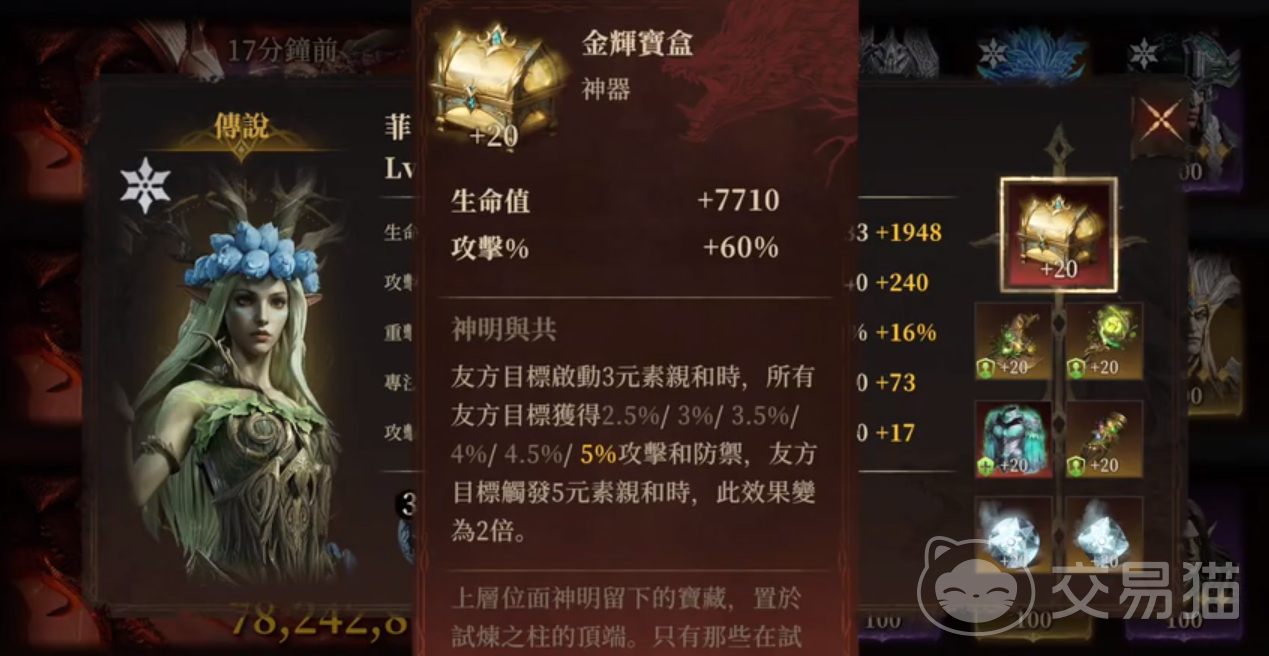 推荐菲洛希亚携带光辉宝盒,这件神器可以给发动元素亲和的队友增加攻击力与防御,每触发5元素亲和的时候,效果还能翻倍。光辉宝盒需要挑战试炼之塔180层,也就是说三个属性60层就能拿到这件神器。装备推荐先祖守护套装,三件套可以帮所有的队友承担15%的伤害