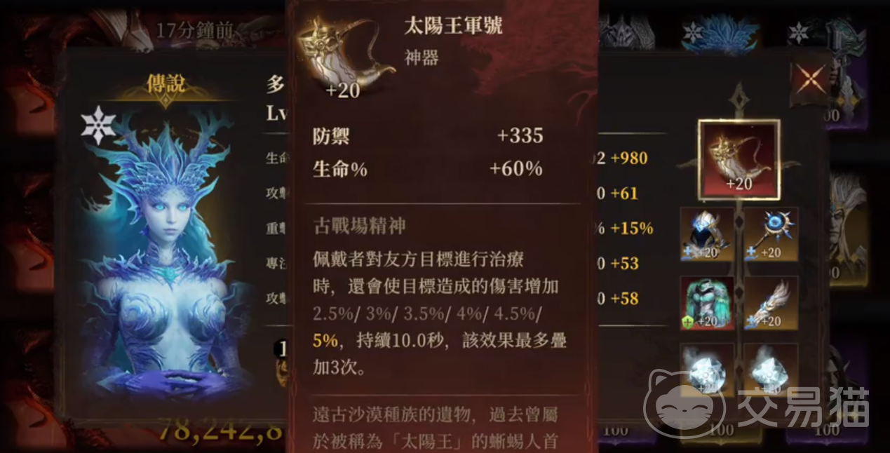 多尔切蒂丝是纯补血的辅助,小编推荐携带太阳王军号神器,效果是对佩戴者的队友进行治疗,还会使目标造成的伤害增加最多5%,协助辅助能力更强。