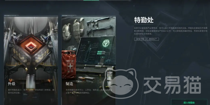医疗部门则专注于医疗包的生产,玩家可以选择绷带创伤药以及急救药等各类医疗物资,而且升级后的制药台产出的医疗包会恢复更多生命值。此外各类物资除了特勤处部门工作台制造外,每个部门还会定点定时提供兑换资源,玩家可以前往军需处按需购买,等级越高的部门会刷新提供更稀有的物资。