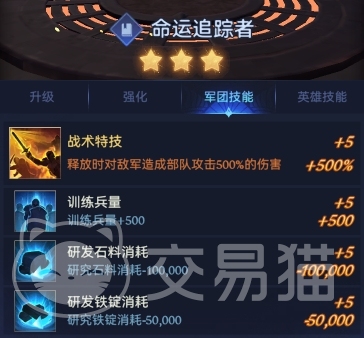 在军团技能方面,其战术特技在释放时,可对敌军造成部队攻击500%的伤害,同时训练兵量也可增加500,研发石料消耗减100,000,研发铁锭消耗也可减少50,000。