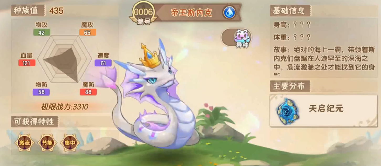 想获得水属性异种,就可以前往水之领域中的水中旧地,这里可以刷到玲珑。这种类型的异种更加偏向于辅助,有着极其美妙的外表。还可抓到帝王斯内克,这个异种的战斗力很强。然后还有斯内克的其他幼年形态,都能从头开始培养并进化。