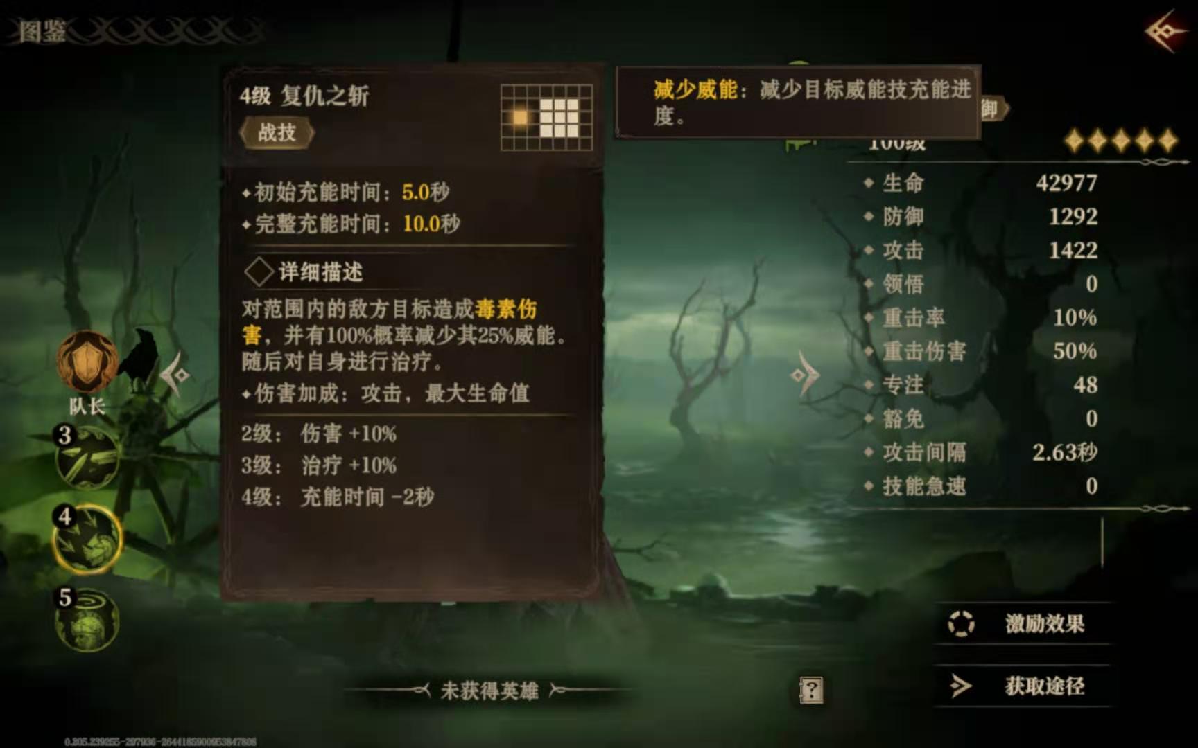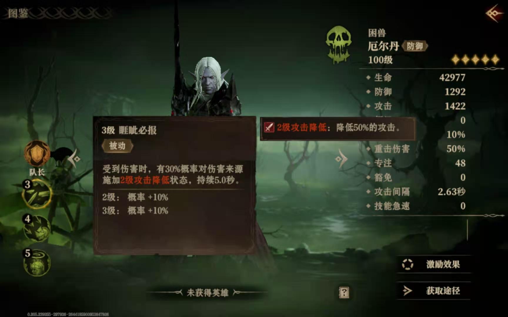 厄尔丹升高到第三级的时候,就能拥有一项新的被动技能睚眦必报,将其放到前排的时候,如果被敌人攻击了,那么有一定的概率去降低攻击者的攻击力并持续五秒钟。
