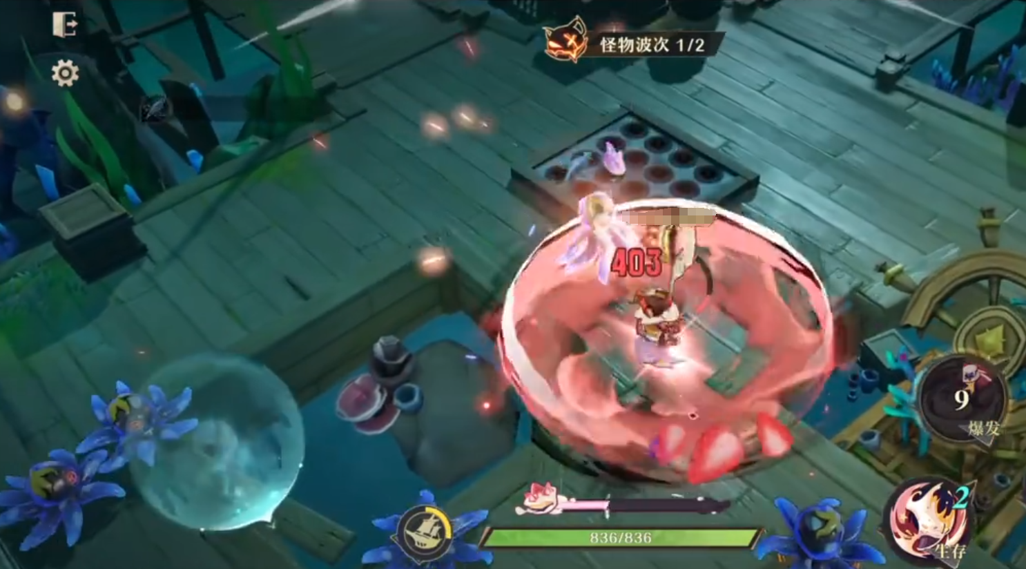 生存技能:果酱开路。甜食之梦向前突进,下一次的普攻变成重击砸地,而且会附加甜蜜冲击的效果,造成圆形范围伤害,同时有一定的概率附加眩晕。这一个生存技能可以接在普攻第3下,如果普工的甜蜜冲击没有造成眩晕,技能可以再补上一个。