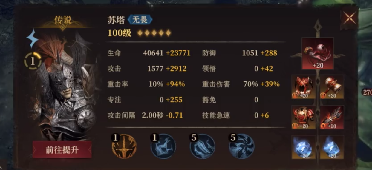 这一套无畏队伍里面,苏塔是破甲与普攻触发的工具人,他的被动技能幻影顺势斩,可以在平a的时候触发重击产生一个幻影,幻影随后对指定目标发动追击。建议属性堆满爆,从而可以保证被动有100%的几率触发。同时,苏塔的大招巨力肢解,发动总共5次连击,并且造成闪电伤害有30%概率触发重击,并且被苏塔大招击杀的敌方无法被复活。