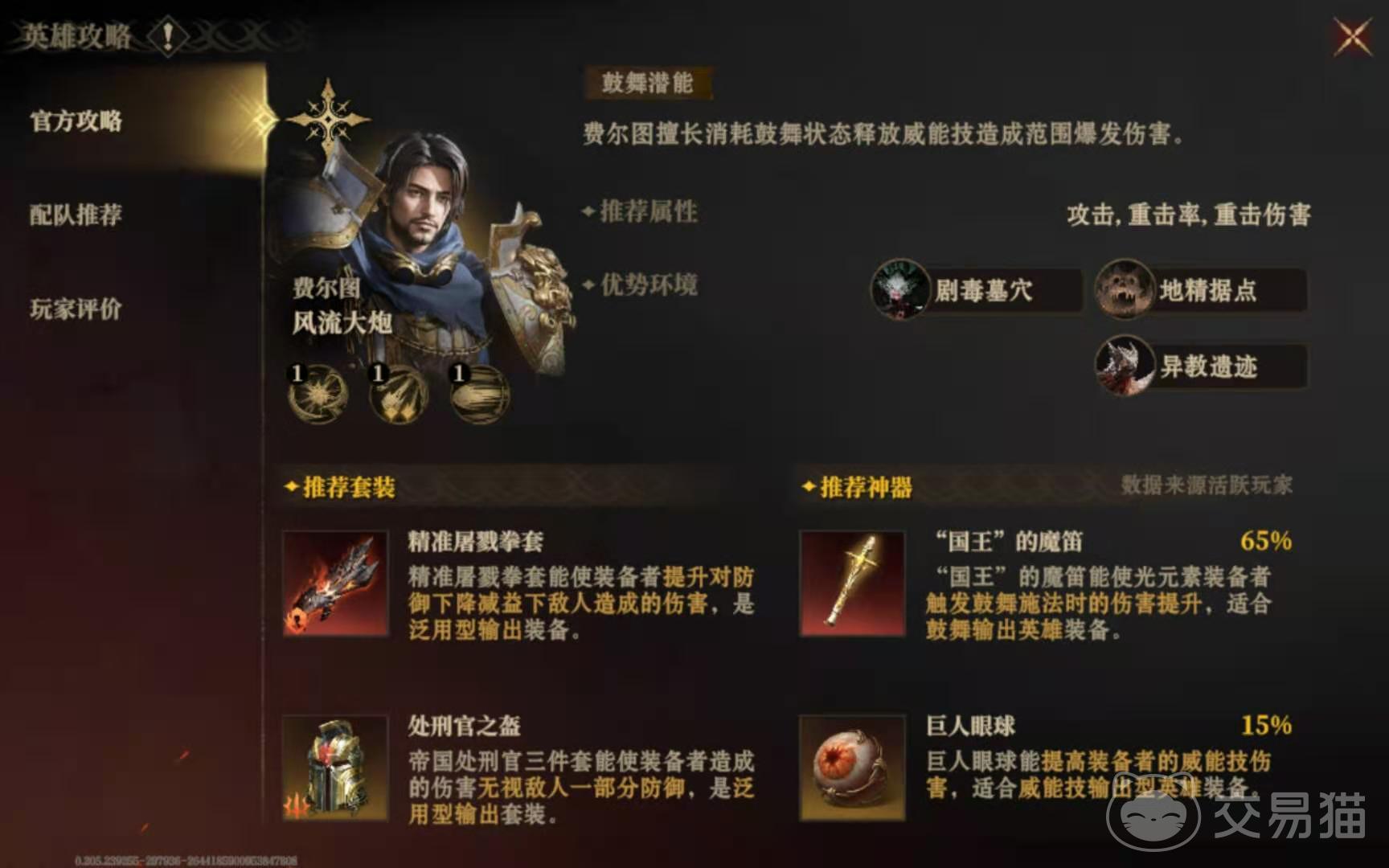 之后要是想让费尔图变得更强,那么就要着重加强它的攻击和重击方面的属性,还有给其搭配诸如巨人眼球、国王的魔笛等神器套装。