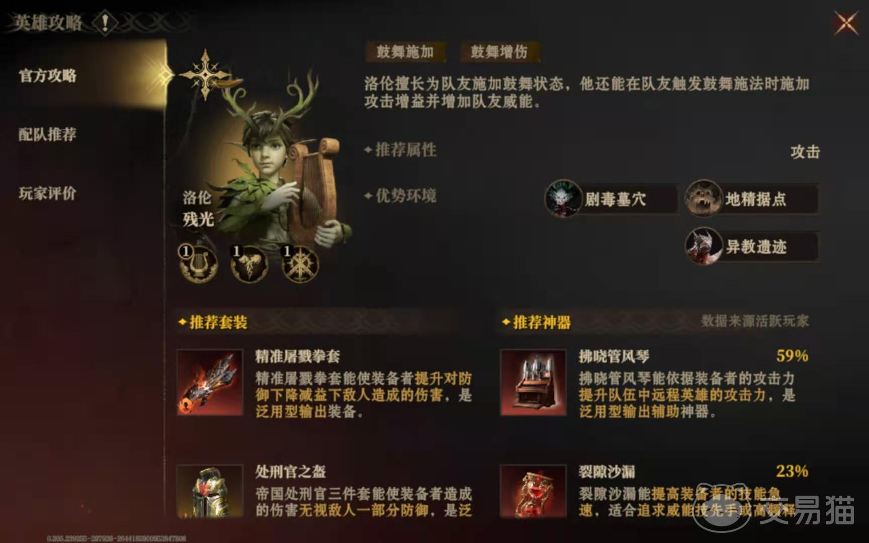 光系英雄特有的一个机制就是鼓舞,而洛伦的特点就是可以频繁地触发这个机制,还可以在队友用鼓舞出招时,为其带来更多的增益效果,在后续的强化中,可以优先提升它的攻击力。