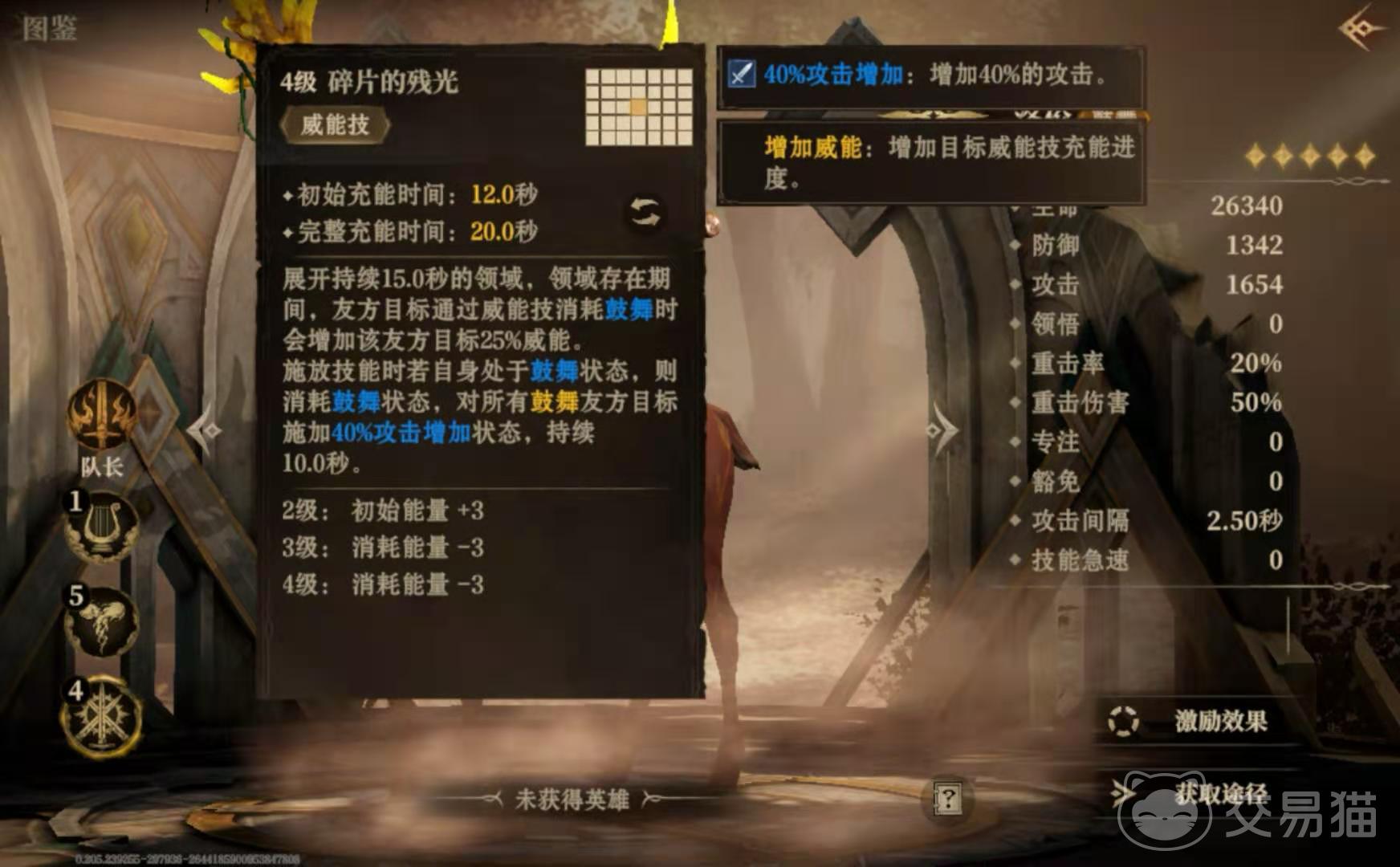 洛伦的威能技碎片的残光在四级的时候就解锁了,这个招式会在本方区域上方形成一个领域,被覆盖的英雄威能值和攻击力都会升高。