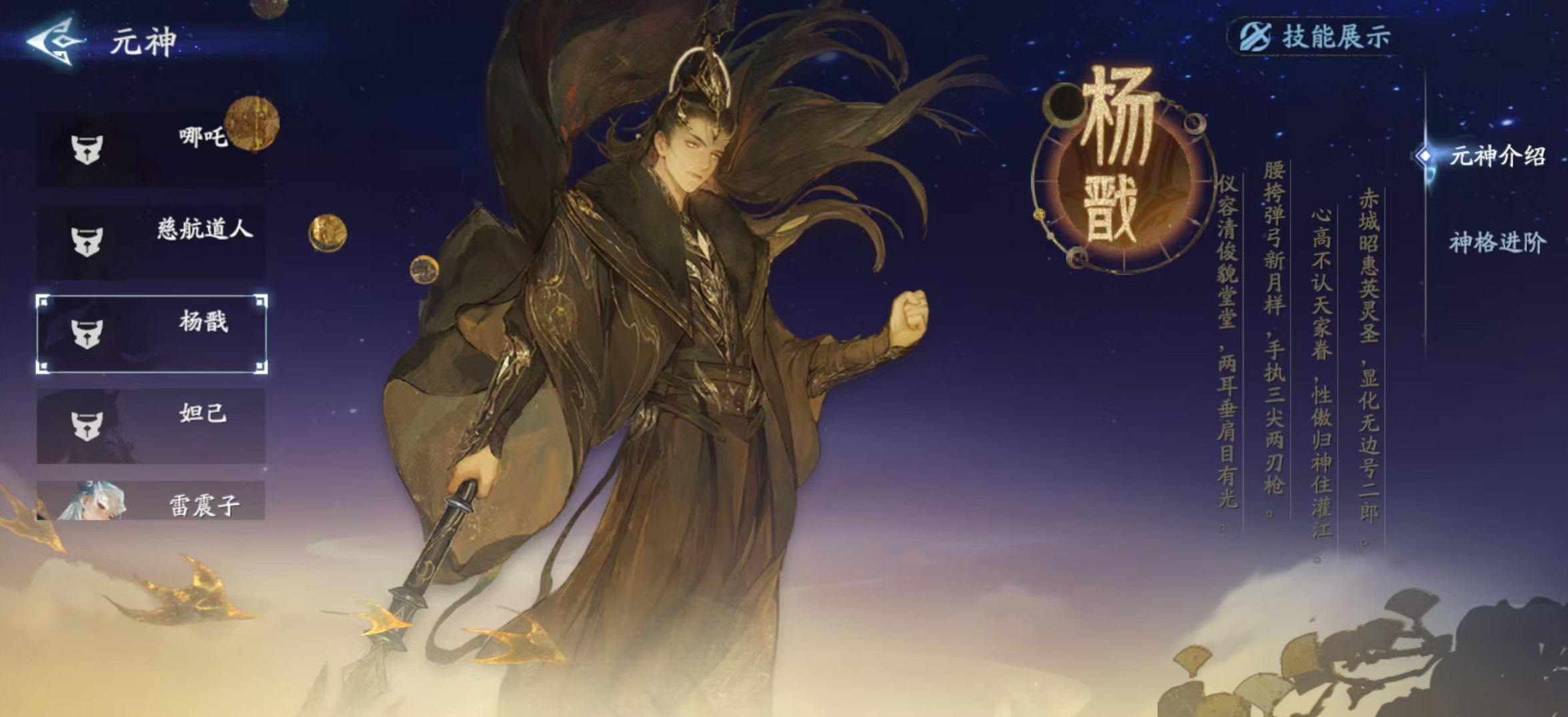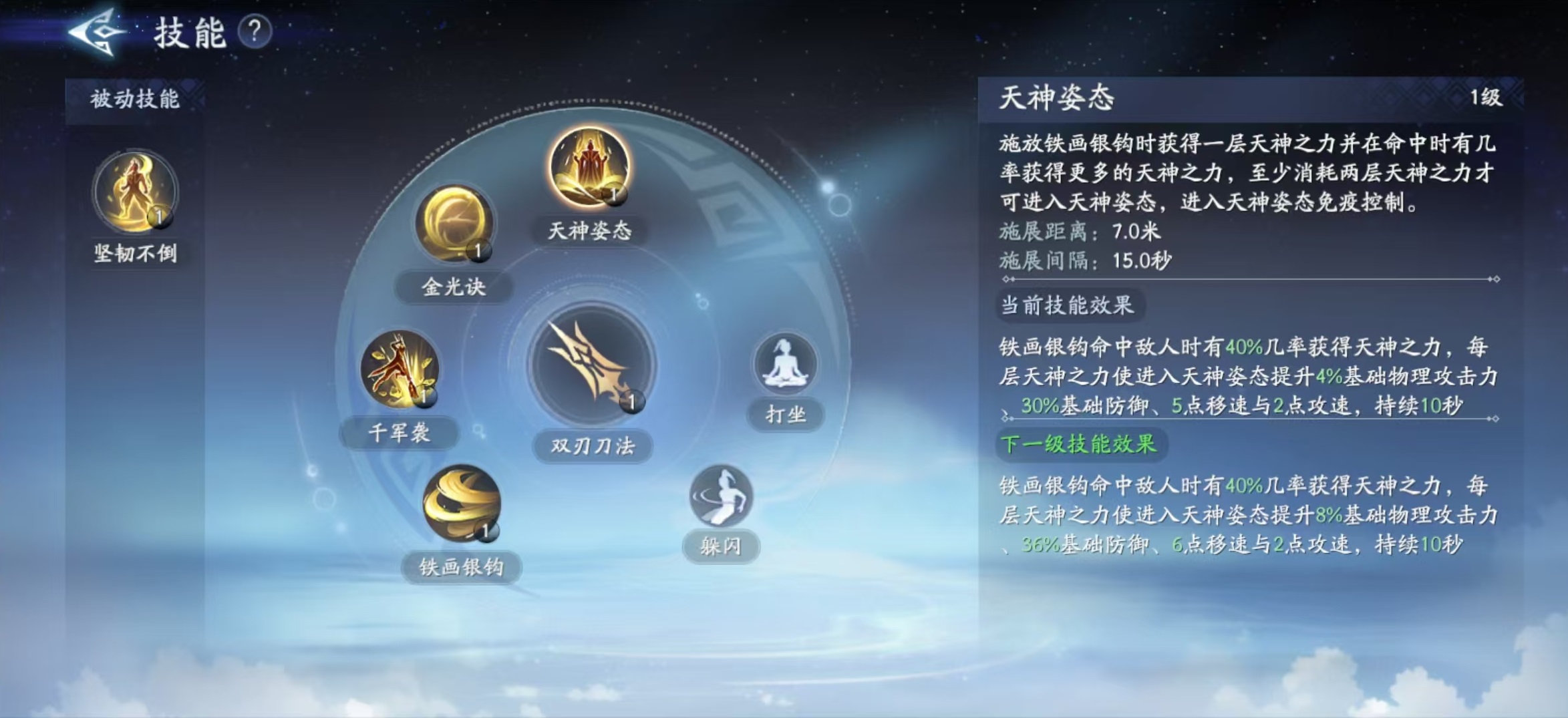 杨戬依靠自身的普攻技能双刃刀法可以近身攻击,对敌人造成伤害。第1个主动技能天神姿态,释放铁画银钩时获得一层天神之力,并在命中时有几率获得更多的天神之力。需要消耗至少两层天神之力可以进入天神姿态,在此状态下免疫控制,每层天神之力都可以提升杨戬的基础物理攻击力,基础防御,移动速度和攻速。在持续时间内可以叠加起来,所以杨戬是属于战斗过程越长实力越强的角色。