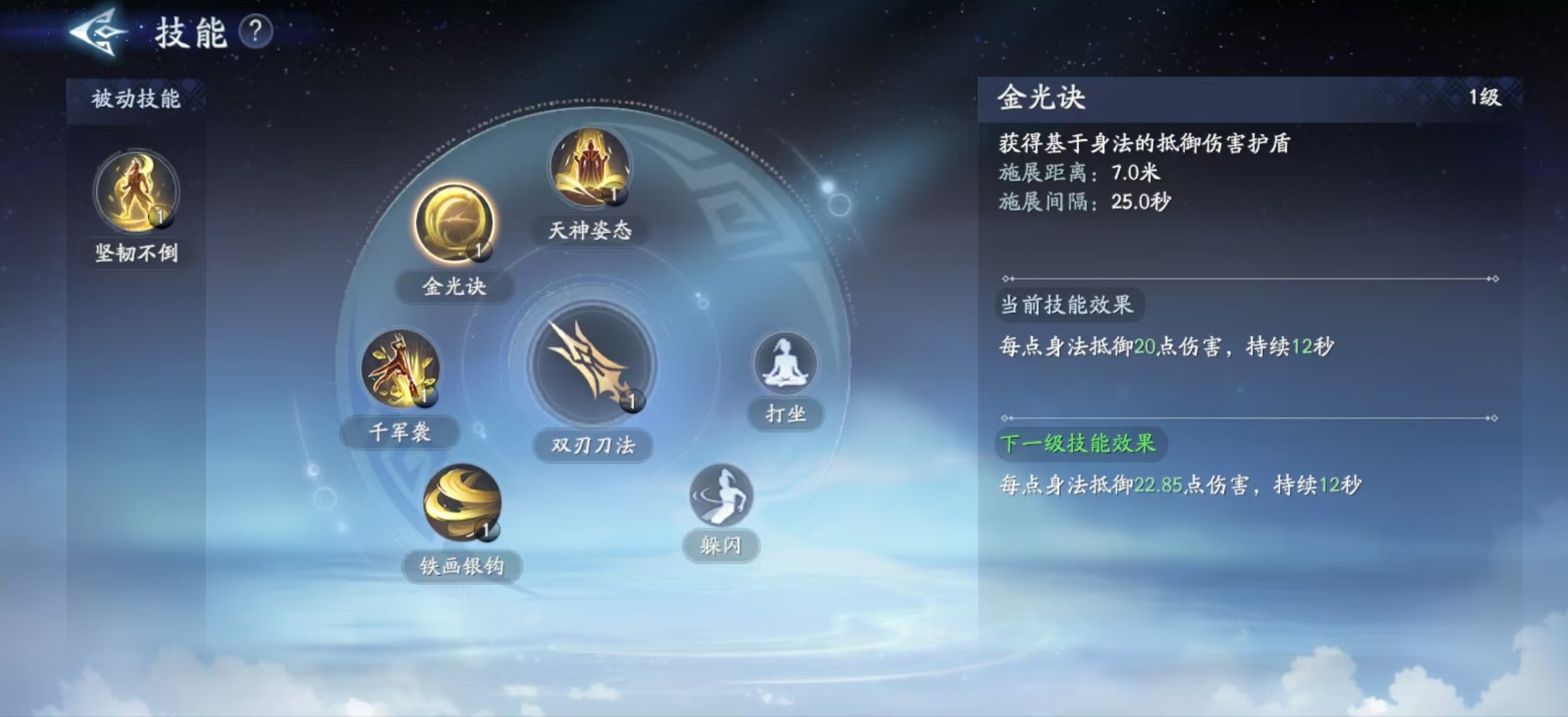 铁画银钩是属于杨戬常用的输出技能,朝身前进行五连击,试展过程中可以进行移动,所以使用起来比较灵活自由。该技能造成的基础物理攻击也比较高,如果能够打满5连击,输出是非常可观的。第3个技能金光决,将获得基于自身身法属性的抵御伤害护盾,技能等级越高,身法带来的伤害抵御效果也就越好。杨戬作为在前方奋战的战士型角色,只有出色的生存能力才能保证承受大量伤害,金光决很关键的技能。
