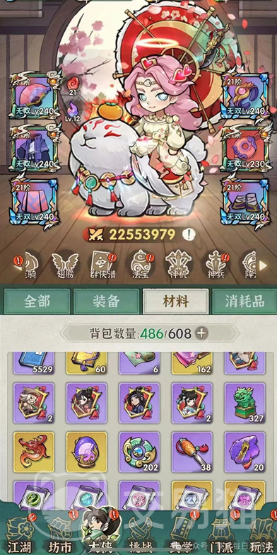 在游戏中装备可是提升战力,轻松过图的关键。首先游戏里的装备主要分为六大类:武器(包括剑,镖,弩,扇),上衣,裤子,戒指,项链和鞋子。每类装备都有其独特的作用:武器和鞋子主要增加攻击力,裤子和戒指则增加生命值,而上衣和项链则能减少受到的伤害。装备还有阶数之分,从低到高共有20阶。每当玩家升级到一定的等级就可以穿戴更高一阶的装备。而每个门派的名称后面跟着的数字其实就是该门派装备的阶数。所以玩家可以提前去挑战对应门派的关卡刷取玩家需要的装备,刷到后直接穿在身上。
