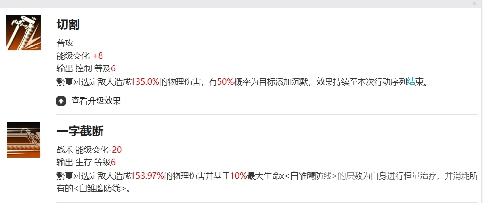 在成功对敌人添加沉默效果时,繁夏会为自身添加1层白雏鹰防线,该效果叠加上限为10层,关卡中战斗可继承,解锁4重门后,切割造成的伤害增加20%。最后,解锁5重门后,繁夏的基础属性再次得到提升,最终达到的就是生命+5.0%、攻击+5.0%、物理防御+5.0%、特殊防御+5.0%的数值,这已经是角色最高的时候能够提升到的数值了,所以大家使用这个时期的繁夏可以有效地辅助队友并对抗强敌。