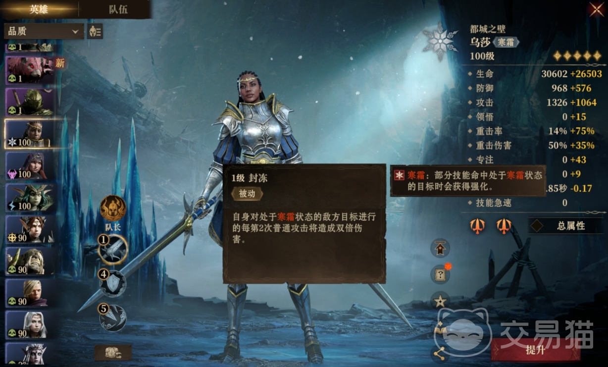 乌莎:作为一名近战输出英雄,简单粗暴的战斗风格非常暴力,乌莎的被动技能让她对寒霜目标的输出能力得到了大幅提升,而她的战技则赋予了她一定的自保能力,让她在战斗中更加灵活多变,当队伍中有专职提供寒霜DEBUFF的角色时,乌莎的威能技伤害会直接翻倍,这种强大的输出能力让她在PVE中的表现尤为突出,甚至能够碾压各系大部分质量不高的紫色、金色英雄,因此乌莎也是冰系最早期的核心输出角色之一。