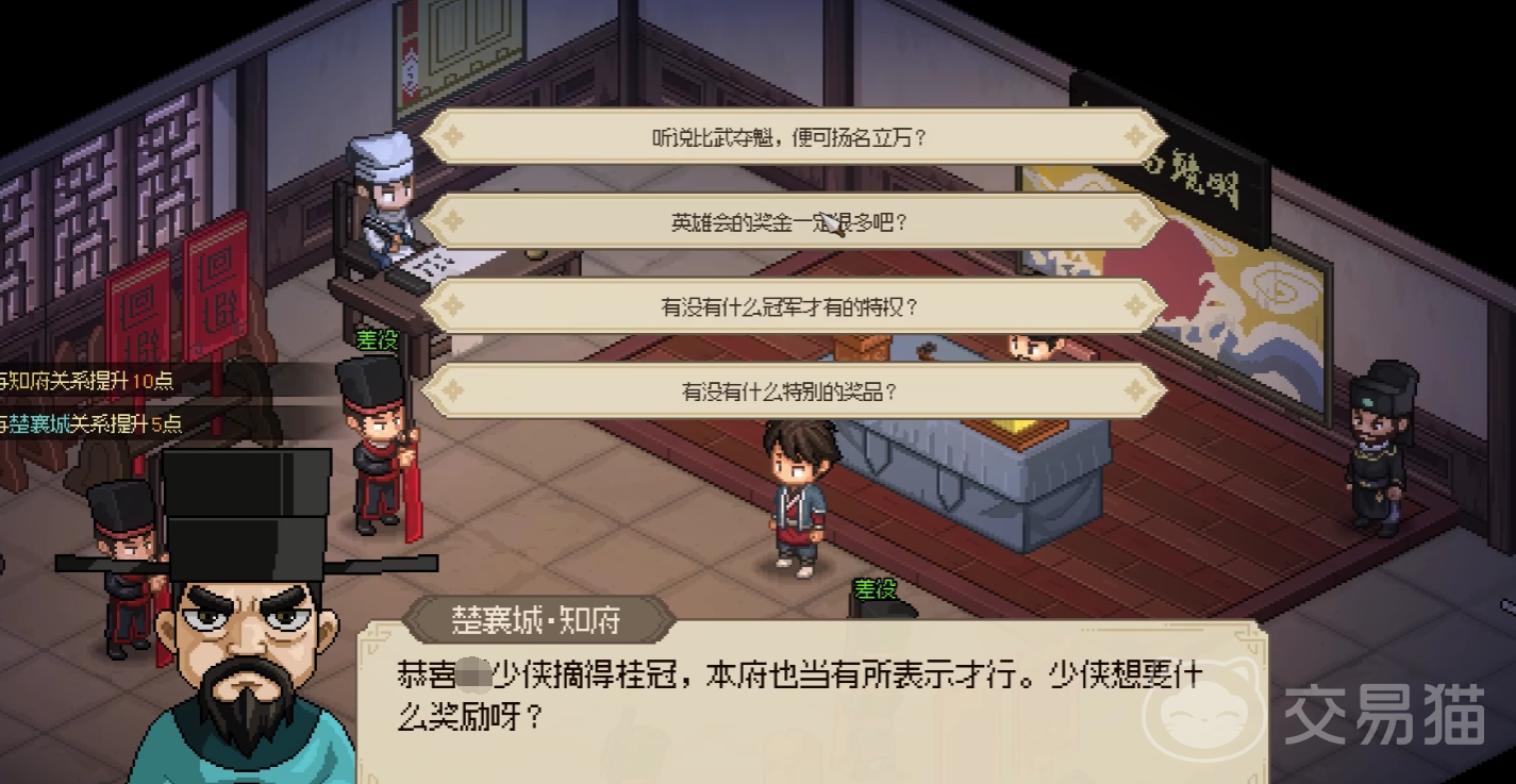 值得一提的是,在玩家赢得了楚襄城英雄会的赛事之后,玩家就会在楚襄城之中一举成名,声望的数值会大量提升,并且会增加楚襄城知府对玩家的技术好感度, 此时玩家可以邀请楚襄城的侠客NPC进入到队列之中。