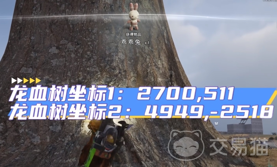 乖乖兔的话是通过砍伐龙血树偶然获得,如果想要获得异色异常物乖乖兔的话可以尝试下小编分享的这两个坐标的龙血树,会有大几率掉落乖乖兔。龙血树的刷新时间较快,可以就逮着一棵树来砍。