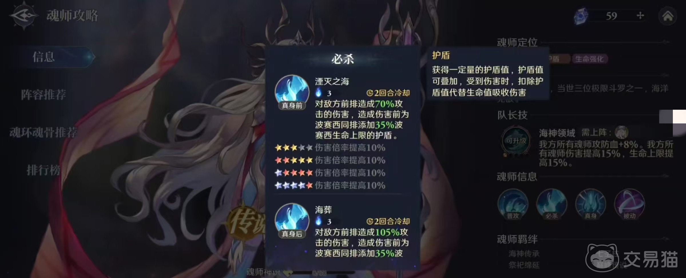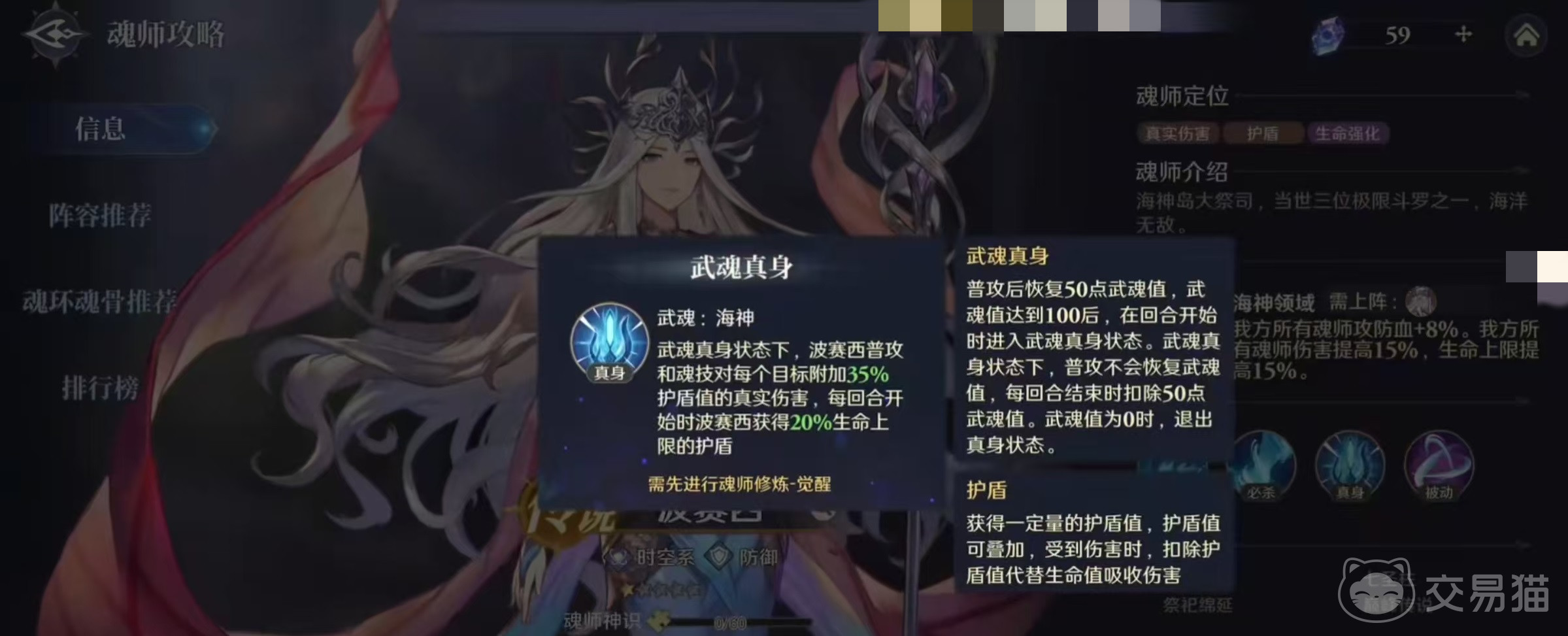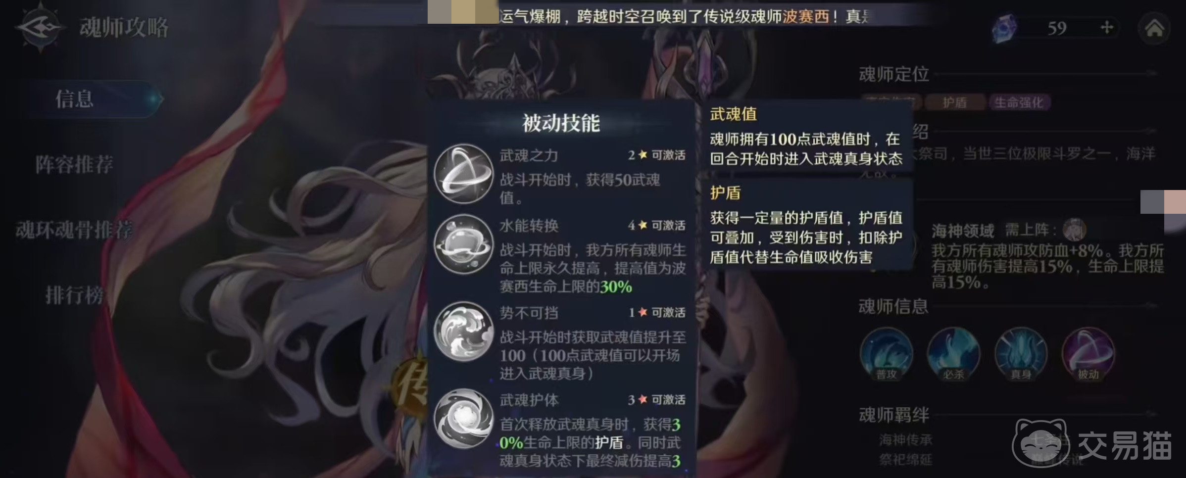 波塞西并不属于在常规池中就可以抽取到的人物,需要大家在指定活动中才能获得,所以获取的门槛比较高,大家更是应该了解他的技能效果。首先来看一下自身的必杀技能湮灭之海,在武魂真身之前,可以对敌方前排造成攻击伤害,并在造成伤害之前为同排的队友添加护盾,按照波塞西生命上限百分比来计算。护盾可以叠加,并且在受到伤害时会扣除护盾值代替生命值吸收伤害,在开启武魂真身之后,对前排造成的伤害更高。