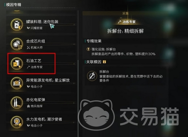 孤狼玩家PVE模因专精选择的逻辑是,能请别人帮忙建的都不要点,像是芯片组、稀有结晶这种可以高价卖的也不建议点,可以用冰茶或是其他办法去换电池。而重点要点的主要是“石油工艺”,这种事关生产资料的。