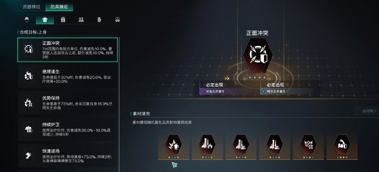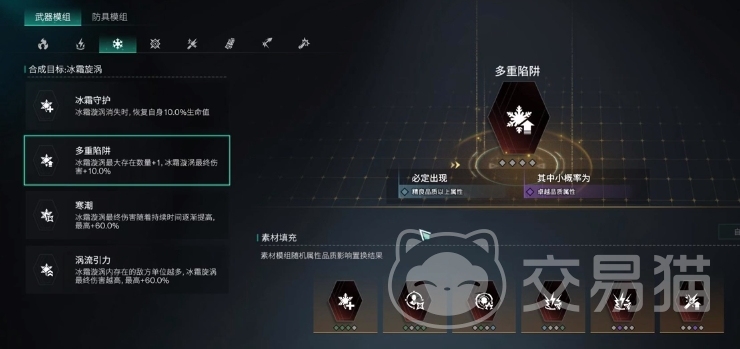 玩家在合成的时候需要先去选定一个目标,这里可以是冰霜守护、多重陷阱、寒潮或者涡流引力等,而在点击以后,就是去选6个不同的素材来进行填充了,根据大家放置的模组不同,其概率出现的词条上也会有差异,比如7级的模组,那么就可必定出现精品词条,而卓越则是概率出现了。