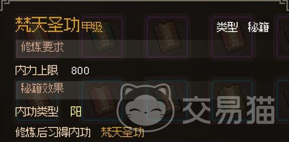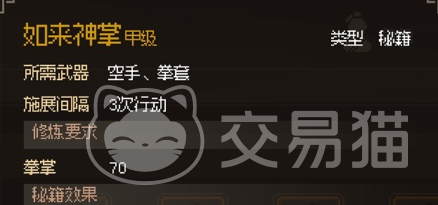 这个是甲级外功,该功法的效果比较特别,这门功法可以强化其他的功法,尤其是少林功法,可以给到这些功法额外的效果,此外还会暗仁德、礼节这些特性来增伤。想要获取需要加入释法寺,去藏经阁读书,在佛法及拳掌到400和50以上,摸完4个石碑以及打赢战斗就能得到。
