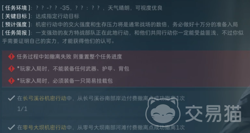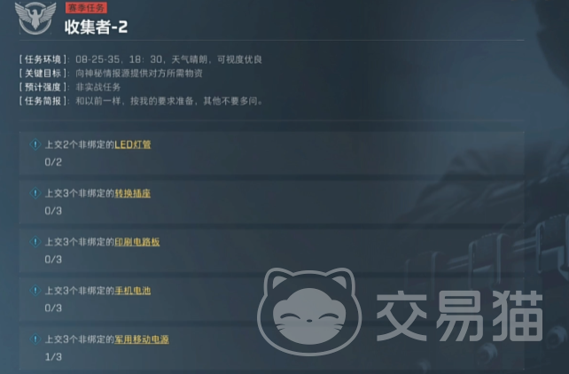 而且,现在也引入了单排,任务做起来还是比较简单的。需要注意的是,提前预留一些非绑定的任务用品,不然到时会卡任务道具就比较尴尬了。特别像是聚乙烯、防弹陶瓷、特种钢这种,可以多去航天基地刷一刷。任务描述中是“上交”的,也可以直接购买。