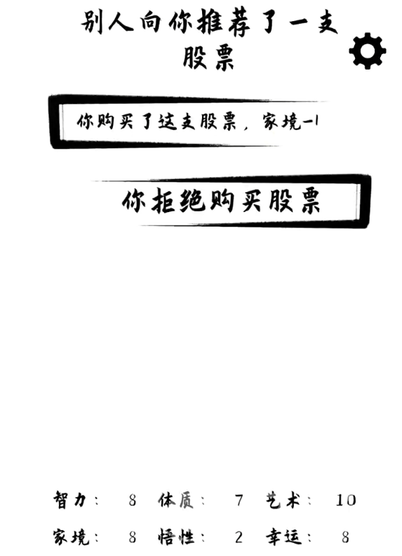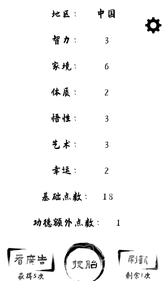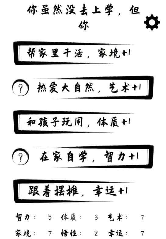 在该游戏中,玩家需要操纵一位投胎的人,然后开始新的一身,这个过程中大家需要操纵该人物的所有行为,这些行为会化为文字选项给到大家,大家需要在其中做出选择,这不同的选择会给到不同的属性。