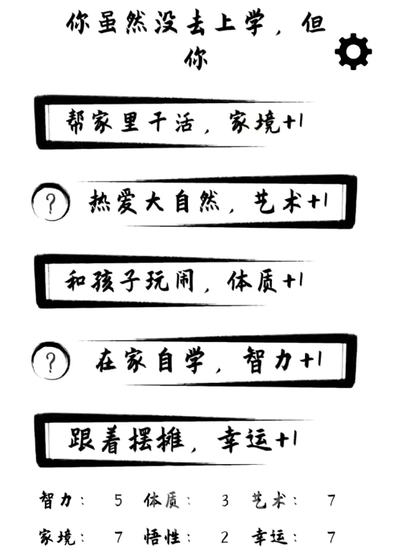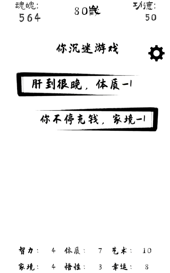 每个玩家在开局的时候还都会拥有投胎点数,自由分配点数到家境、悟性、幸运、艺术、体质和智力中,会有不同的人生选择,比方说幸运高的可以遇到各种奇遇时间,走上创业道路,艺术高的可以当上演员或艺术家,玩家可以在开局时决定不同的路线,并且还能在每一世获得更多的功德,为下一世获得更多的点数,让生活更加轻松。