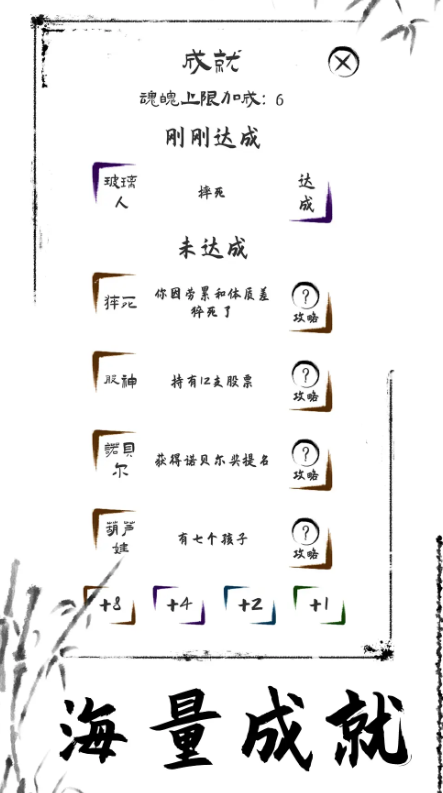 游戏拥有一百多个不同的成就,和雨果奖、百万粉丝、奥运冠军等多个不同的结局,玩家可以为了点亮这些成就不断轮回,在获得满满成就感的同时也能更好的享受不同的生活,体验不同结局带来的乐趣。
