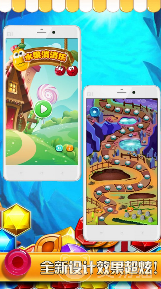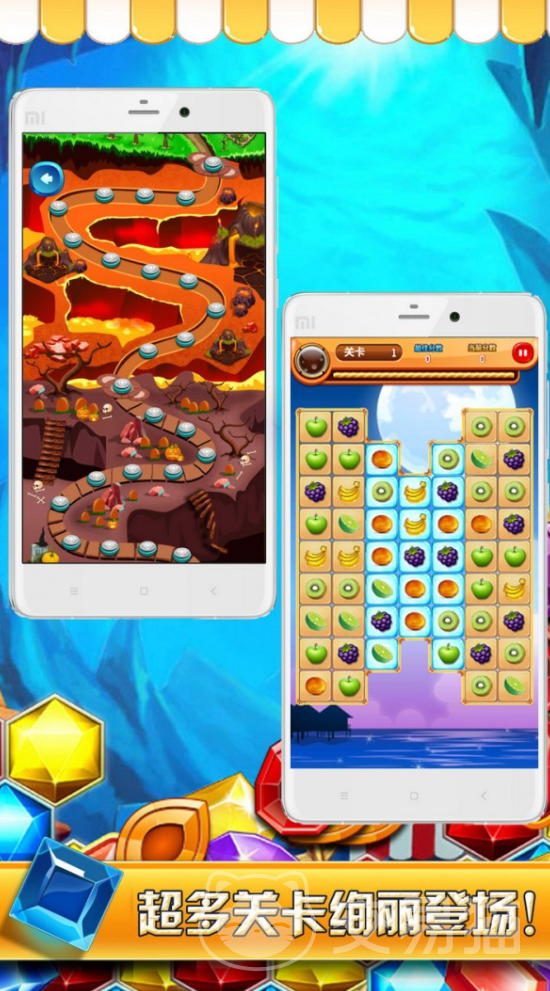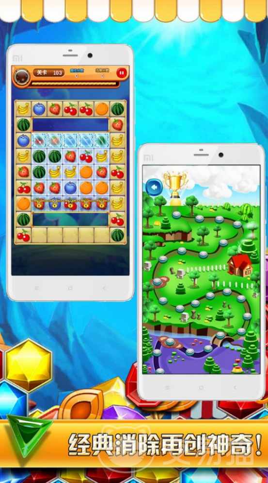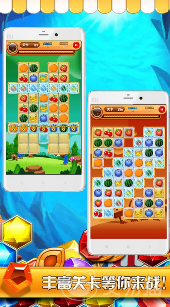 这款游戏采用的是闯关的玩法,小伙伴们在每一个关卡中都会遇到画风完全不同的地图,这些水果的排列方式也是完全不相同的,小伙伴们要做的就是通过移动水果的方式来把相同的水果放在一起。这样他们就会消除,并且为大家带来分数。每一关所需要的分数都会有所提高,小伙伴们可以尝试着在游戏里挑战一下自我。