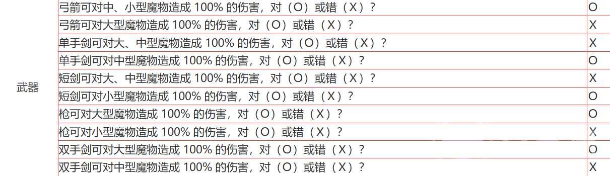 还有考验武器类的问题,在这里有一个是:弓箭是否可对中、小型魔物造成 100% 的伤害?答案是 O。弓箭作为远程攻击武器,在面对中、小型魔物时能够发挥出全额伤害。不过,面对大型魔物时,弓箭的伤害输出会有所折扣,所以如果你专门打大型魔物,可能需要换个更合适的武器了。