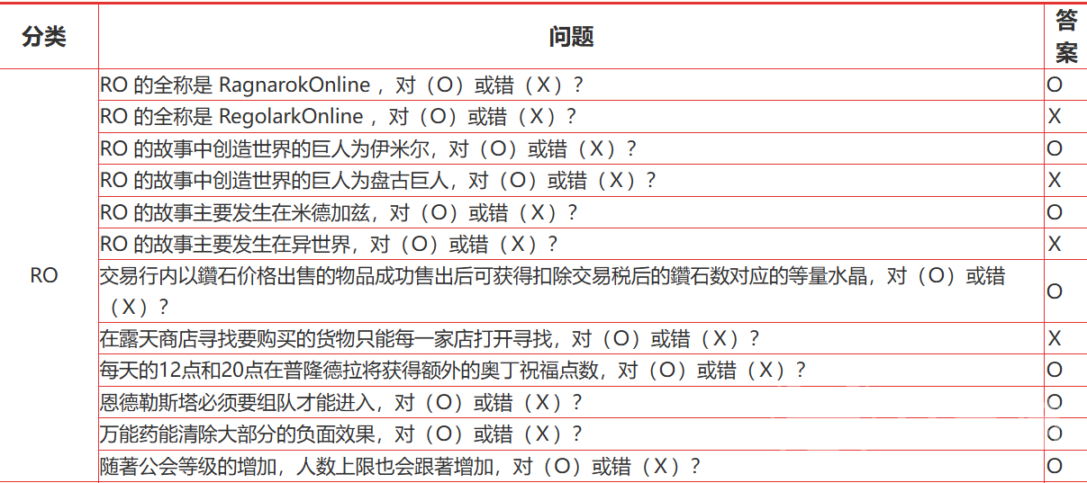 像第一道题目就问RO的全称是Ragnarok Online,大家觉得是对还是错呢?答案是 O。Ragnarok Online 是这款经典游戏的全称,它的故事背景来源于北欧神话,讲述了神与巨人之间的纷争,玩家们将在这个世界中展开冒险。千万别被其他类似名称迷惑哦。