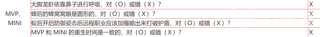 这里还有个题目是问大脚龙虾是否依靠鼻子进行呼吸,答案是 X。大脚龙虾其实不是通过鼻子来呼吸的。这个题目乍一看很容易让人混淆,但实际上,龙虾类生物是通过鳃来呼吸的,它们没有类似哺乳动物那样的鼻子,所以答案是错误的。
