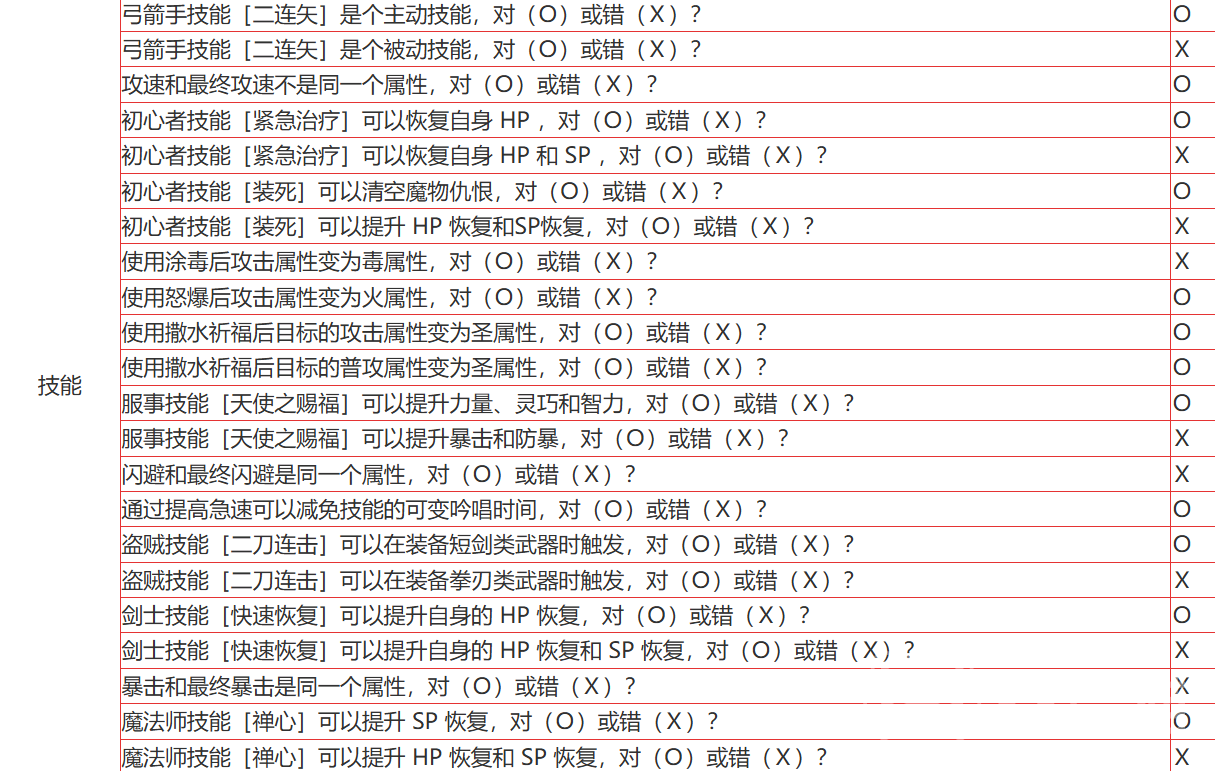 最后再给大家讲解一下这个题目:弓箭手技能[二连矢]是个主动技能,是对还是错?答案是 O。二连矢是弓箭手的经典技能之一,它属于主动技能,在对敌人进行连射时能够快速连续地发出两次箭矢攻击,适合用来快速清理敌人。因此,这个技能在PVE和PVP中都非常常见。