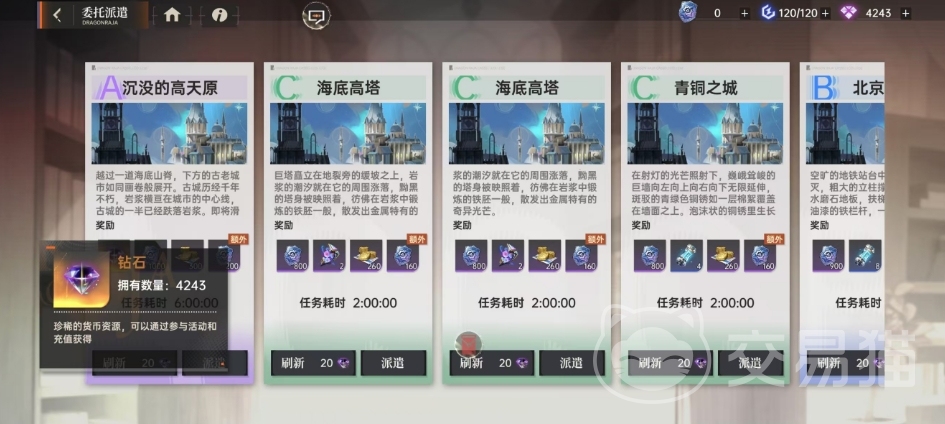 钻石是游戏中一种非常珍稀的货币资源,通常只能通过参与活动或充值获得,它是抽卡和在商店购买物品时最常用的货币之一,因此建议玩家优先参与A级任务,以获取更多的钻石和其他丰厚奖励,由于每天参与派遣的次数和时间都有限,如果当前没有出现A级任务,玩家可以消耗道具来刷新任务列表,此外为了方便玩家,系统还提供了一键选人的功能,玩家可以利用这个功能快速组建阵容并直接派遣角色执行任务,只需点击“出发”即可完成派遣。