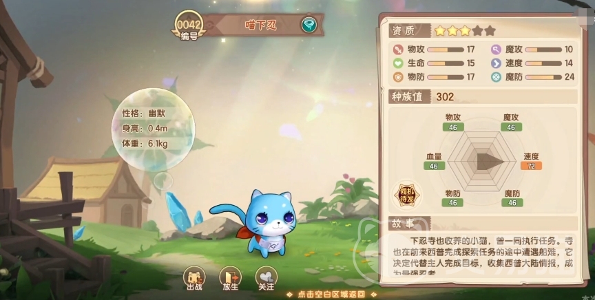 喵上忍在战斗中展现出的速度优势还是比较明显的,它的技能狂风术能够为其增加60%的速度,持续整整六个回合,这样的速度加成使得我们在进攻时往往难以占据先机,稍有不慎就会被其反击得手,同时喵上忍的防御能力也不算一个弱点,通过技能喵忍术分身,它能够为自己添加高达60%的防御加成,同样持续六个回合,这样的防御提升使得玩家在攻击时需要更多回合才能对其造成伤害。