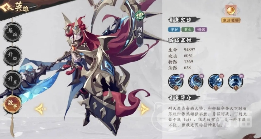 而刑天则是炎帝麾下的一位猛将,在游戏中刑天不仅伤害惊人,还具备嘲讽技能,能够在战斗中吸引敌方火力,保护队友免受伤害,刑天的舞干戚技能使其在被敌方攻击后有概率进行反击,造成可观的物理伤害,而战神增益技能则能显著提升其物理防御力与免疫力,增加他的坦度,此外不屈怒吼的嘲讽效果与猛志的重生能力更是让刑天在战斗中可以成为一个超强的前排。