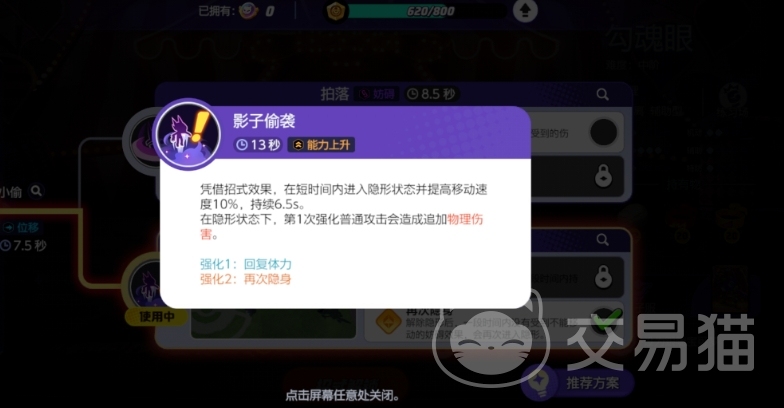 即使在重新进入敌人视野后,也能维持短暂的隐形效果,为发动突袭或撤退提供不错的时机,而强化后的普通攻击,不仅能够迅速接近敌人实施先手打击,还能根据战况施加减速或恐惧效果,使敌人陷入混乱,当勾魂眼达到四级时,玩家需要在拍落和影子偷袭之间做出选择,这两个技能中大多数玩家都会倾向于选择影子偷袭作为进阶技能。