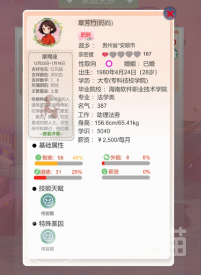 在这个游戏里有着极强的随机性,不只是玩家的孩子,就连玩家本身也都是出生在各种情况的家庭中,个人的能力背景也都是游戏事先已经规定好的,所以只能在这个基础上通过做出不同的选择改变人生的走向,每一个角色都会有对应的属性值,可以通过提升这些不同属性的数值让自己的人生在此后发生变化。