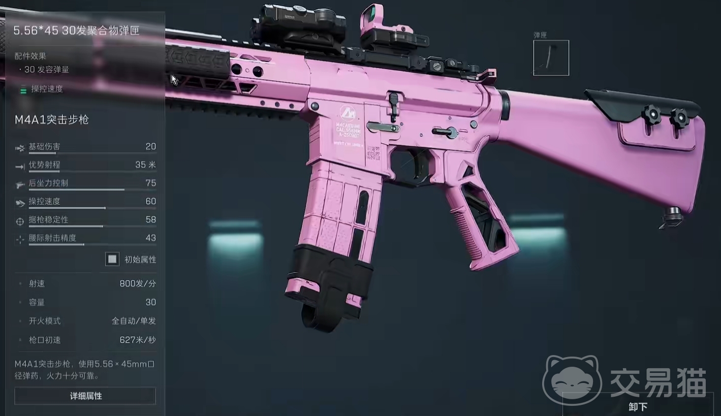 先来说一下m4a1的基础参数,基础伤害有27点,射程40米,后坐力控制60,操控速度64,据枪稳定性51,腰际设计精度55。护甲伤害32,射速800发/分,容量30,枪口初速575米/秒,枪声传播距离500米。通过数据很明显能看出来,后坐力控制这一项是它的短板,伤害也有点低,不过稳定性和精度还行,通过一些改造可以让它成为堪比T0级的枪械。