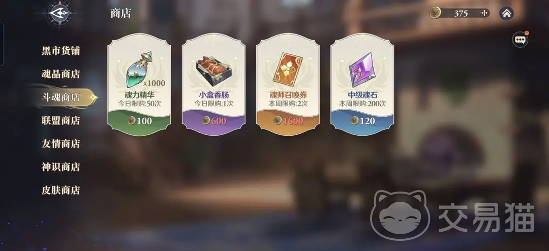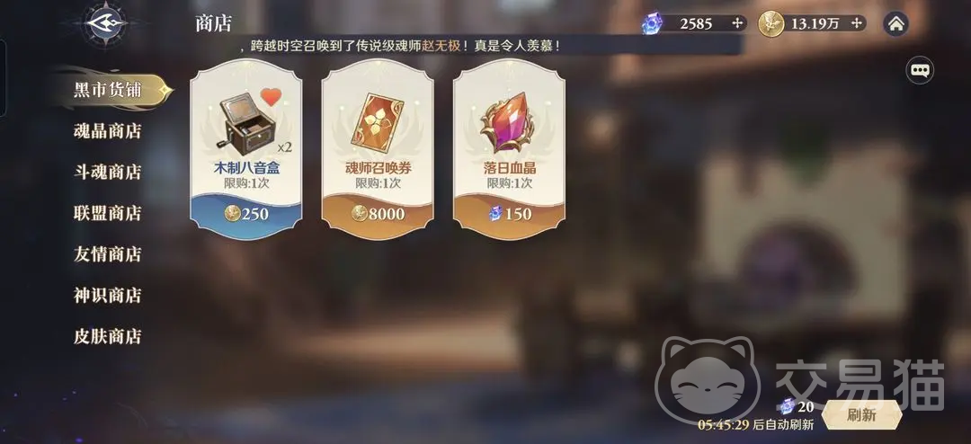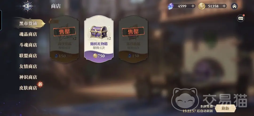 首先说黑市商店,这里面比较推荐买的有两种,一个是落日血晶,可以根据个人情况酌情购买,另一个魂师召唤券就是必买的道具了,黑市里面自然是有很多好东西,有些可以使用金魂币购买,有些需要使用魂晶,每天还有一次刷新的机会。