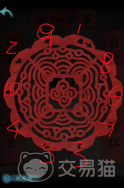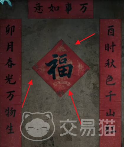 接下来,进入楼梯间。在这里,你会看到地上散落的碎玻璃。不要忽视这些碎玻璃,它们将是后续解谜的重要道具。观察墙上的“福”字,你会发现其四角的叶子数量并不相同。这些叶子的数量其实是在暗示你糕点丝带的切割顺序。利用之前拾取的碎玻璃,按照这一顺序割断糕点绳子,并拼好糕点。完成这一步后,你将得到一块带有特殊符号的纸月饼。