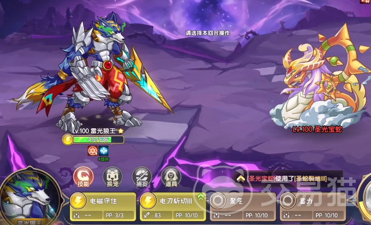 紧接着到了玩家战斗的回合,这时候可以使用电磁守住去攻击对手,为了能快速消减对方的血量,需要使用电刃斩切再次攻击,等接着再轮到玩家对战的时候就可以依次是用蓄力这个技能去攻击对方,随着几个回合的对战,玩家很有可能会出现血量大减的情况,那在这个时候要借助红泡泡这个道具提升一下精灵的物理攻击能力。