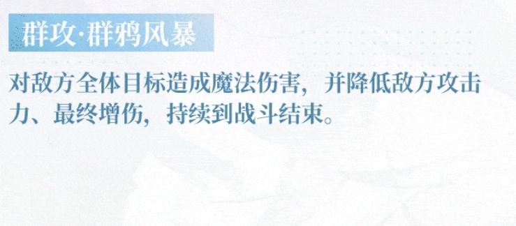 在此期间,该目标受到的伤害会得到一定的提升,同时从治疗技能中获得的恢复效果也会减少20%,更为关键的是,这种影响是无法通过任何方式驱散的,这使得摄魂之爪成为了快速消灭关键敌方单位的关键技能,在战斗中黑鸦夫人还能召唤一群漆黑的乌鸦猛扑向敌方全体,造成一定的伤害,这种伤害的独特之处在于其分配机制,它由所有受攻击的敌人共同承担,但任何一个敌人所承受的伤害都不会超过总伤害的一半。