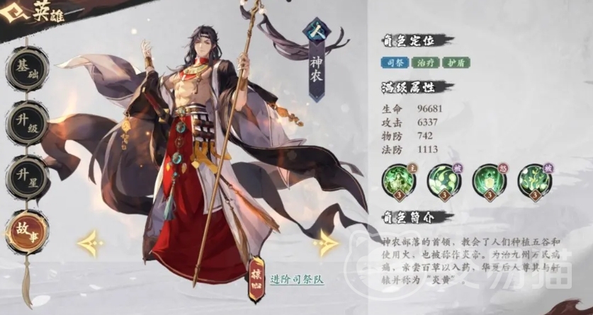 神农是目前最强的奶妈角色,她不仅能够为队友提供及时的治疗,还能通过增加护盾来提升整个阵容的肉度,所以很多缺少辅助的队伍当中大家都需要培养一个神农,技能上面他可以对自身释放护盾,效果,这个护盾能够吸收相当于神农生命值上限6%的伤害,同时神农还能对全体友方施加法防提高的效果,这个效果能够被动地增加队友的血量、法术抗性和生命值,它可以使队友的生命值提高10%,法术抗性提高10%。