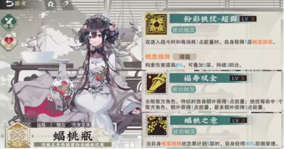 蟠桃瓶属于输出角色,无论被动技能还是主动技能都以输出为目标。主动技能桃花落射程为两格,对自身没有消耗,决定的敌方单位可造成自身攻击力100%的伤害。职业技能射程两格对自身消耗1冷却2.对选定的敌方单位造成130%的伤害。