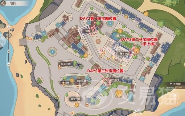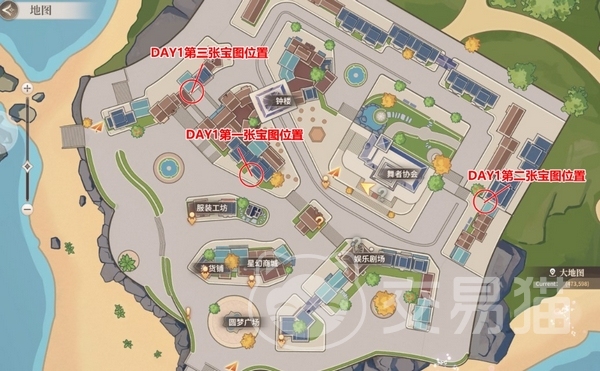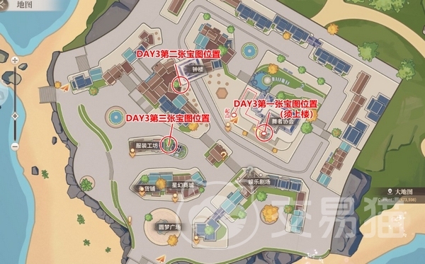 游戏中玩家会遇到不少类似的问题,比如说“寻找宝物”的位置,这个其实是在【欢乐剧场中央】的雕塑,但是要在游戏中的白天才能找得到。还有玩家想知道海滩的神秘生物在哪里,这个其实是在大地图上左下角的石头那里,游戏中到了晚上会有一个发亮的金堆。